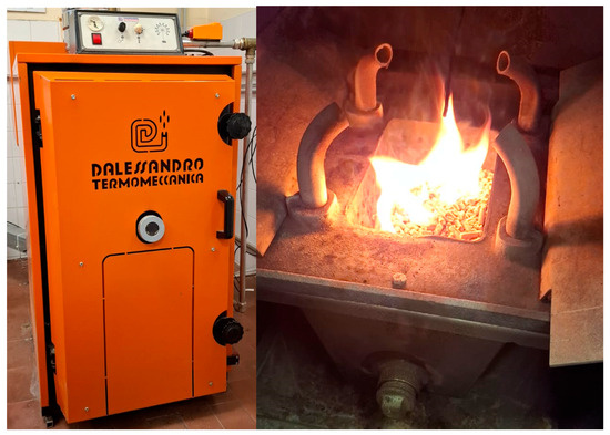 The present tests were conducted using a domestic wood pellet boiler, specifically a CSI18 (Figure 1) with a nominal power of 24.4 kW, manufactured by D’Alessandro with a forced draught system. The pellets were fed into the combustion chamber from the pellet hopper via two motorized screw conveyors. The boiler uses an underfed burner. The continuous operation of this system reduces the risk of flame return and, consequently, the propagation of biomass combustion to the storage system. The feeding rate of the pellets is regulated by the operator based on the type of material used. The boiler allows the combustion of fuels such as pellets, hazelnut shells, walnut shells, olive pits, peach pits, or similar materials, provided that their moisture content does not exceed 30% of their weight. The operating principle of the boiler involves a stainless steel deflector that forces the combustion gases to reverse their flow direction within the furnace, thereby increasing the residence time of the gases in the combustion chamber and consequently enhancing heat transfer to the boiler walls. After exiting the combustion chamber, the gases pass through a series of tubes designed to improve the boiler’s efficiency by recovering additional heat before releasing the residual heat through the chimney.