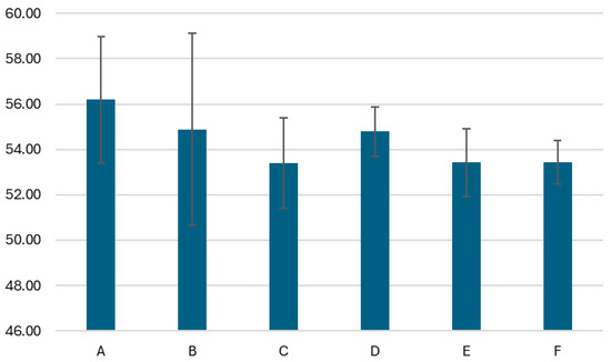 Figure 3 shows the efficiency of the six pellet brands using the direct method; the values range from 53.39% in pellets C to 56.19% in pellets A. Overall, the efficiencies are low, below 55%, due to the use of a rather old boiler, manufactured in 2004, and with little maintenance. It should also be noted that better efficiency could be achieved if the test duration were extended. It is important to consider that the tests were conducted only until the water temperature reached 90 °C. This point also corresponds with the first combustion stop and, consequently, a decrease in the fuel load. The heat loss method for determining efficiency provides results that are closer to reality in this case, as this method is independent of the fuel flow rate.