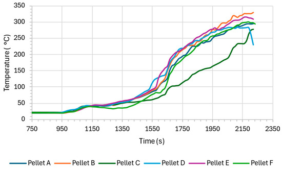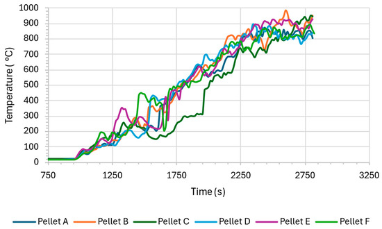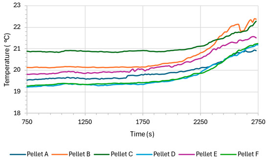 Figure 5 shows the variation in ambient temperature during the combustion tests. Initially, from 750 to approximately 1750 s, the ambient temperature remains relatively stable across all samples. After 1800 s, the ambient temperature begins to rise more sharply for all pellets, but at different rates. This can be attributed not only to higher calorific value but also to combustion stability and flame temperature. The result shows an increase in temperature around 2.5 °C in all tests.