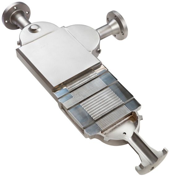 A photograph of a commercial PCHE (Kelvion Thermal Solutions, Nantes, France) showing the stacking of plates with straight and zigzag channels and inlet- and outlet headers.