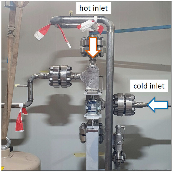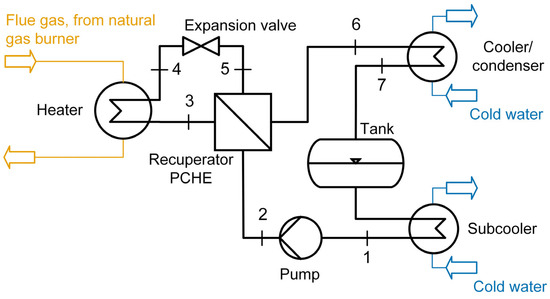 The experiments conducted in this study were performed at a test facility for supercritical CO2. In Figure 3, the layout of the closed process shows a recuperated Rankine cycle. In addition, the measurement devices employed in this study are presented in Table 1. Here, liquid CO2 (state 7) was subcooled prior to entering the piston pump (state 1). At the cold inlet of the PCHE (state 2), the CO2 was liquid at a supercritical pressure. The heater provided the heat input into the cycle and was powered by natural gas. The expansion valve simulates the pressure loss of a turbine. At state 5, the working fluid was at a subcritical pressure that is a function of the condensation (states 6 and 7) and the pressure losses in the PCHE, coolers/condensers, and the piping. Note that two coolers/condensers were operated in series between states 6 and 7. At state 7, the CO2 was fully condensed. A more detailed description of the test facility can be found in the literature [25].