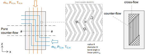 The layout of the PCHE. This overview includes the inlet conditions, channel details, and crossflow and counterflow areas (mixed-plate arrangement). Orange and blue lines show the direction of hot and cold channels, respectively.