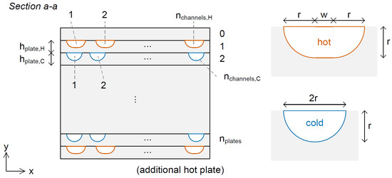 These characteristics are due to the manufacturing process. Figure 1 shows the construction process of a PCHE. Here, thin metal plates undergo chemical etching to create (mini or micro) channels with maximum diameters of only a few millimeters. Then, the etched plates are stacked and diffusion bonded to produce a heat-exchange block. Typically, PCHEs are classified according to the shape of their channels. In addition to straight channels, the most common channel types are zigzag, wavy, s-shaped fin, and airfoil channels. The typical cross-section is semicircular; however, other approaches, e.g., rectangular, circular, or a stretched semicircle, are used. Figure 2 shows an overview of the channels, cross-sections, and arrangements.