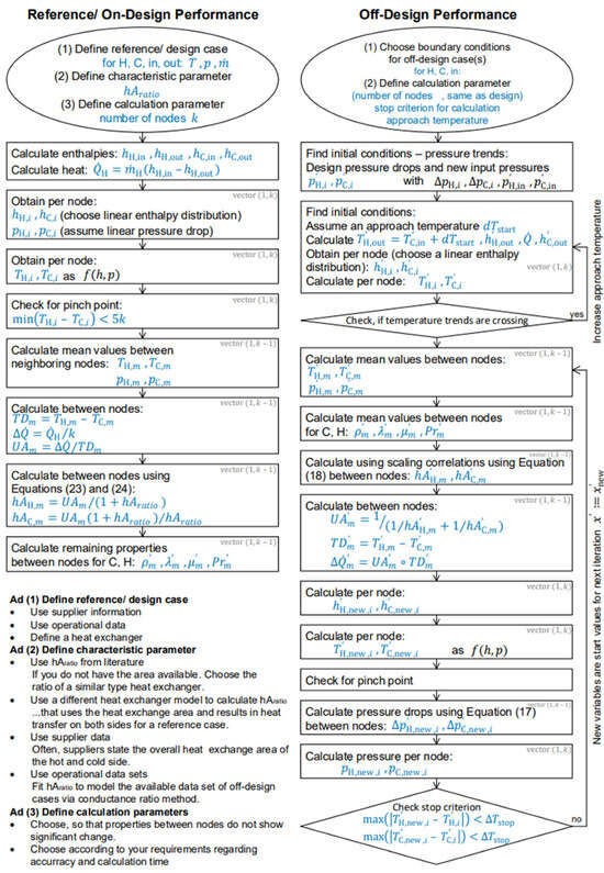 The conductance ratio method [24] is a fast and easy way for the off-design calculation of heat exchangers without requiring a heat-exchange area. Instead, a single value, i.e., the conductance ratio, characterizes the heat exchanger in its reference case. The off-design heat transfer is scaled from this reference case, where all conditions at the inlets and outlets are known.