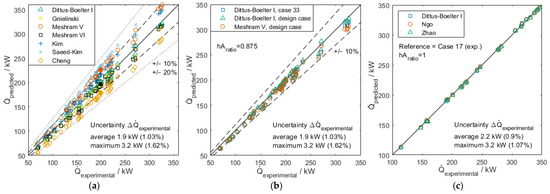 It is evident that the simplest version of Equation (1) can only be a fair approximation [13]; thus, the following correlation, which was introduced by McAdams [14] in 1942, generally yields good results [15] while being remarkably simple:
