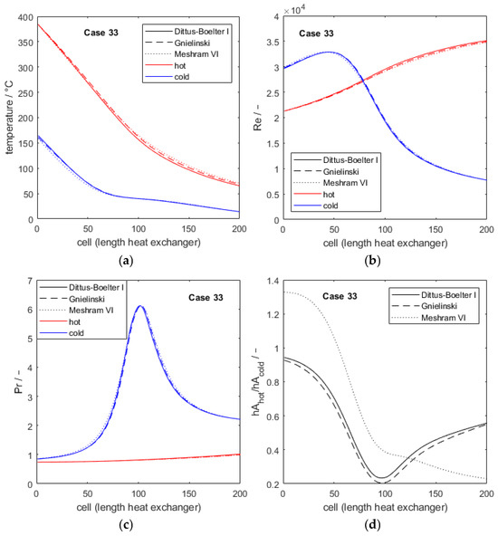 Conventional heat-exchanger modeling can be performed according to the VDI Heat Atlas [18] methodology. Here, the inputs are the (effective) areas of the hot and cold sides, the thickness of the plate between the sides, the fluid inlet conditions at both sides (temperatures and pressures), the correlations for the heat-transfer calculation, the number of sections for the discretization, and the starting conditions for the calculation.