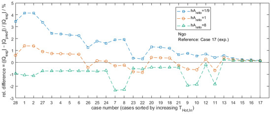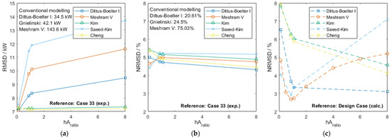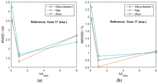 So far in the literature, the conductance ratio method has been used per default with the Dittus–Boelter coefficients , on the cold and on the hot side. Crespi et al. [4] suggested for a better fit for a water-CO2 PCHE, and Rodríguez-deArriba et al. [32] used and for a molten salt-CO2 shell-and-tube heat exchanger. Note that the other correlations and their coefficients can be employed with the scaling formula as long as the geometrical parameters are canceled out. Thus, Gnielinski’s correlation is not suitable for the conductance ratio method.