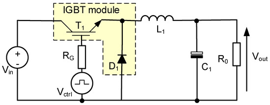 The considered converter contains four components. The first of them is an IGBT module, FF50R12RT4. Two IGBTs and two diodes connected in an inverter branch are included in this module. Only one diode and one transistor from this module are used. The gate of the transistor is connected with an external source of the control signal Vctrl via a resistor RG of resistance 56 Ω. The energy storage component is an inductor L1 of inductance equal to 1.412 mH. This inductor contains a ferrite core. The capacitor C1 has a capacitance equal to 10 mF. The resistor R0 is a load of the tested DC-DC converter, whereas the voltage source Vin represents the power supply of this converter.