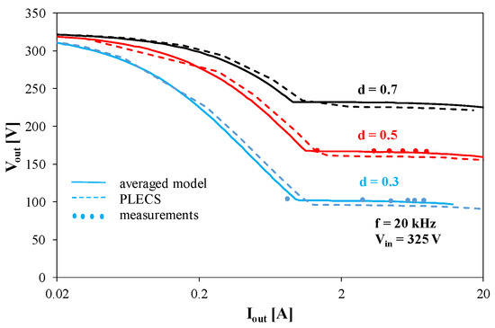 Figure 3 shows that the proposed model provides a good match between the calculations performed using SPICE and PLECS and the measurement results. The discrepancies between the results of measurement and computations do not exceed 2% for the proposed model and 8% for the PLECS model. An increase in the d coefficient value causes an increase in the output voltage Vout of the tested converter. For the used values of load current Iout, the tested converter operates in both CCM and DCM. The critical current below which the converter operates in DCM is about 1 A and decreases with an increase in the parameter d. For high Iout current values, a drop in the Vout voltage value is visible. This is caused by voltage drops on the converter components.