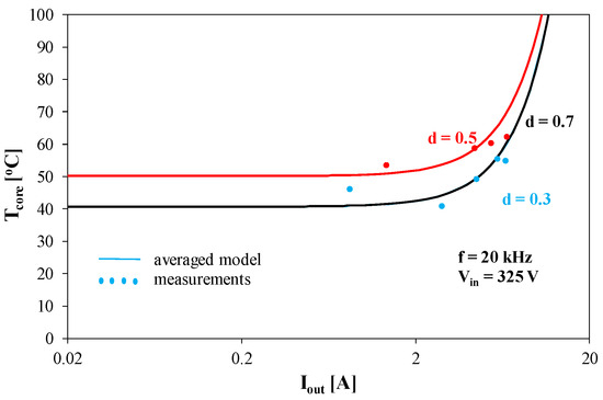 The presented curves show that at low values of Iout current, the core temperature does not depend on the value of this current, because the main reason for the increase in the core temperature is a hysteresis loss proportional to the converter input voltage of 325 V. The curves Tcore(Iout) obtained for d = 0.3 and d = 0.7 overlap. The influence of the d factor value on Tcore temperature is visible in this operating range. For higher values of Iout current, an increase in the Tcore temperature value is visible as a function of this current. This is caused by an increase in losses in the inductor winding and mutual thermal couplings between the winding and the inductor core [22].
