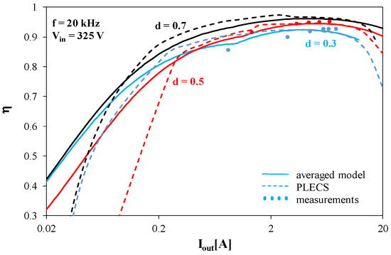 The dependences η(Iout) obtained using the measurements and computations have maximums at Iout equal to about 6 A. The value of this maximum increases when the coefficient d increases and reaches as much as 96% at d = 0.7. The decrease in energy efficiency in the range of high currents is related to an increase in losses in semiconductor devices. The dependences η(Iout) obtained using PLECS software are consistent with the measurement results only for high values of the output current, whereas in the range of low values of Iout, the calculated values of energy efficiency are underestimated. The obtained results suggest that the model of the tested DC-DC converter implemented in PLECS software describes the power losses in a simplified form. In contrast, the results obtained using the considered averaged model fit well with the measurement results.