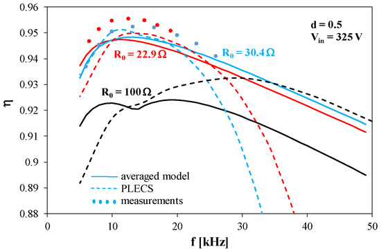 The dependences η(f) obtained from the measurements and calculations have a maximum. With an increase in resistance R0, the frequency at which this maximum is observed increases. The value of energy efficiency increases for lower values of resistance R0. The efficiency rapidly decreases in the range of low frequency due to the DCM operation of the tested converter. The considered dependences obtained using PLECS software show a fast decrease in the range of high frequency and low load resistance. The obtained results suggest that the switching losses in semiconductor devices are overestimated.