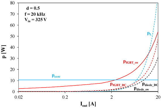 Figure 13 and Figure 14 present the influence of current Iout on the above-mentioned components of power losses. The results shown in Figure 13 correspond to d = 0.3, whereas the results presented in Figure 14 correspond to d = 0.5. The computations were performed for f = 20 kHz.