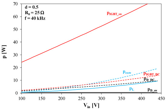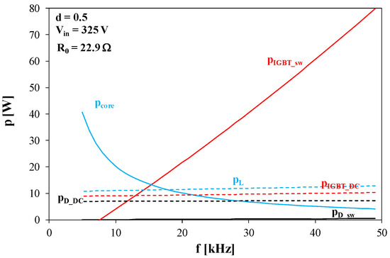 In all the figures in this subsection, the solid lines denote the loss components related to switching, and the dashed lines indicate the loss components related to conduction. The particular loss components are marked with the following symbols: PL—inductor winding losses; Pcore—inductor core losses; PD_DC—diode conduction losses; PIGBT_DC—transistor conduction losses; PD_sw—diode switching losses; and PIGBT_sw—transistor switching losses.