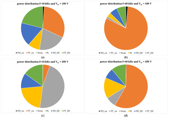 Distribution of the power losses in the tested DC-DC converter in selected operating conditions: (a) f = 10 kHz and Vin = 100 V, (b) f = 40 kHz and Vin = 100 V, (c) f = 10 kHz and Vin = 450 V, (d) f = 40 kHz and Vin = 450 V.