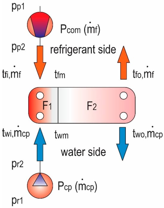 The input parameters of the algorithm: the active surface area of the plate condenser, the constant physical characteristics of water, and refrigerant. The input temperatures of the water and the refrigerant ( t w , i and t f , e ) are variable constants. Figure 2.