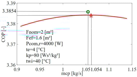 The coefficient of performance (COP) is the objective function for the optimization procedure [17,18]. Its equation with the efficiencies of the circulation pump and compressor is extended. The equations for heat flows, performance expressions, and efficiencies all depend on the water’s mass flow and inlet temperature. Such a complex system of equations is best solved numerically using, for example, Newton linearization and Gaussian elimination. The model’s solution program is part of MATLAB 2015a.