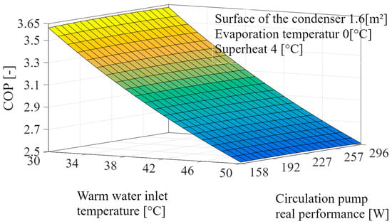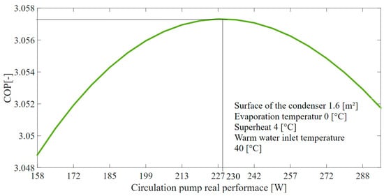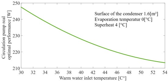 The basic numerical procedure determines the optimal value of the mass flow rate for a given water temperature. Using the optimal mass flow rate, the optimal performance of the circulation pump and the maximum COP can be determined. In the study, the program was extended to cover changes in water temperature in the range of 30–55 °C. As a result, the maximum COP and the optimal performance of the circulation pump can be determined for each value of the varying water temperature.