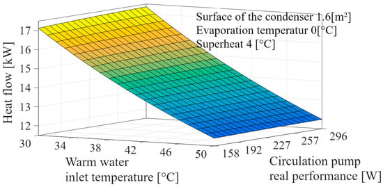 The heat flow value increases slightly with the increase in the circulation pump performance and decreases significantly with the increase in the inlet water temperature, but without extrem, see Figure 5. The COP and heat flow diagram show a similarity. It is understandable, since the heat flow value dominates among the terms in the COP equation. Its average value is about 4 times higher than the compressor power, 6 times higher than the well pump performance, and 12 times higher than the circulation pump power value.