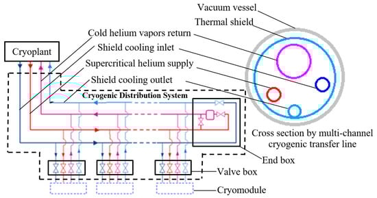 Any cryogenic system is composed of multiple interdependent subsystems that facilitate the efficient cooling, circulation, and recovery of helium as well as the safety, control, and helium storage system. Despite different functionalities, each helium cryogenic system must consist of a certain number of key elements, including the helium refrigeration and liquefaction plant (cryoplant), the cryogenic distribution system, and the cryomodules or cryostats housing superconducting devices. A general scheme of the helium cryogenic distribution system is presented in Figure 2.