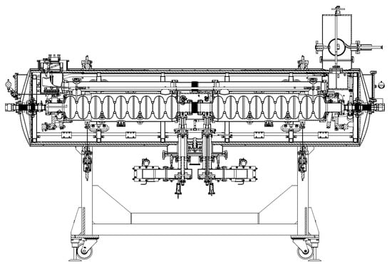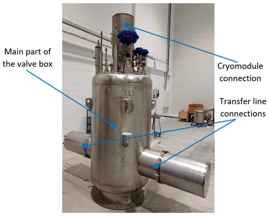 The design and optimization process must consider not only key parameters, such as the required cooling power and helium conditions necessary for the proper operation of the resonant cavities, but also practical constraints, including the facility′s location and the available space for system installation. An example of such a challenge was the need to reduce the external dimensions of the devices that were part of the CDS. As a result, the dimensions of the vacuum tanks in the valve boxes were limited, and thus the cryogenic equipment—valves, compensation elements and flowmeters—were densely packed. The internal structure and vacuum vessel of an example valve box from the cryogenic distribution system for the PolFEL are shown in Figure 14 and Figure 15.