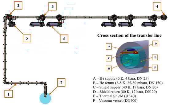 Top view of the PolFel cryogenic system: (1)—multichannel cryogenic transfer line; (2)—gun valve box; (3)—valve boxes; (4)—endbox; (5)—gun cryomodule; (6)—cryomodule; (7)—cryoplant (1–4: parts of the CDS).