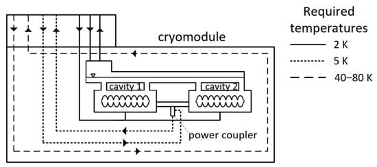 A schematic view of the cryomodule with marked pipes (lines) indicating the required helium streams at specified temperatures is shown in Figure 6.