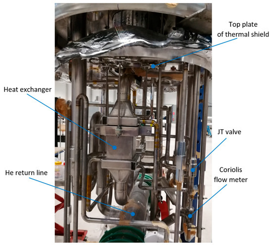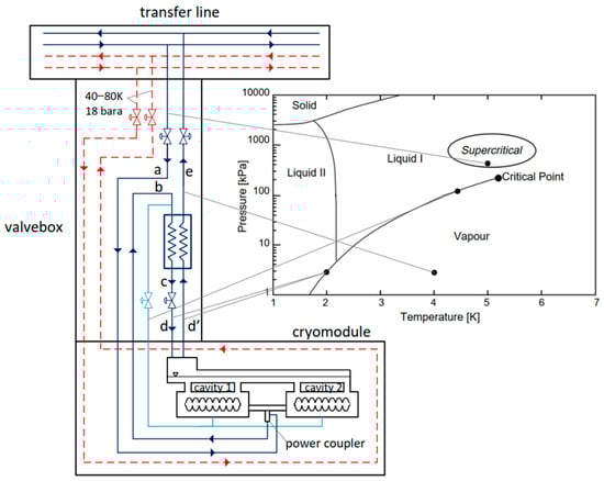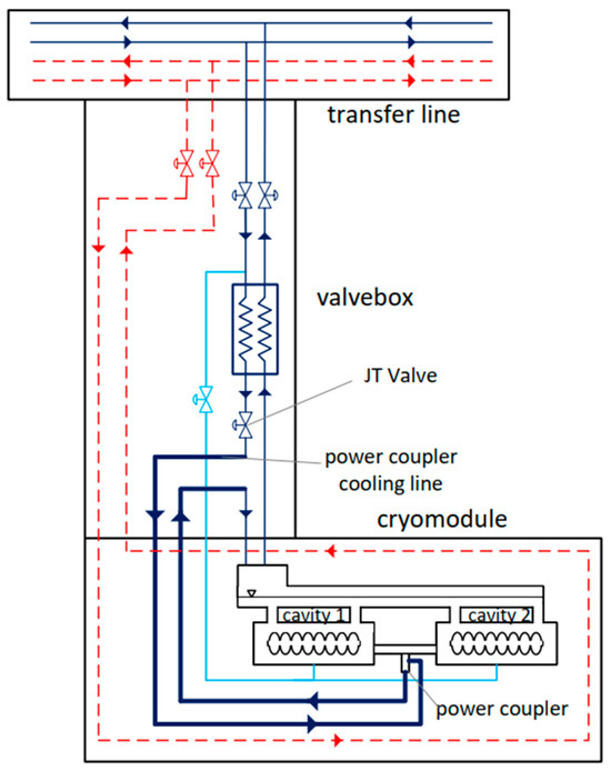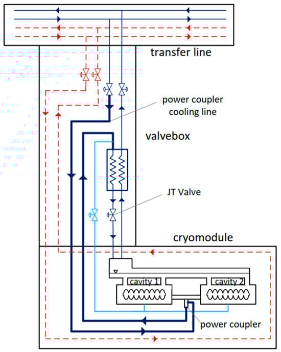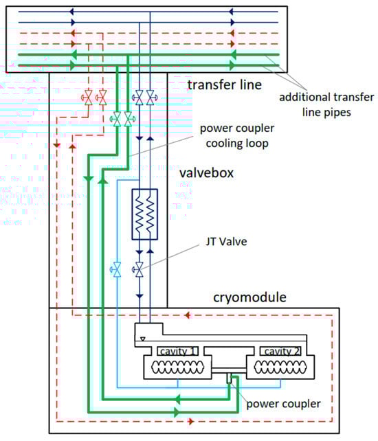 The third solution involves cryostating the power couplers using the same flow of supercritical helium that will be utilized to cryostate the superconducting radiofrequency (SRF) cavities after it has been cooled in the heat exchanger and throttled. For this purpose, a connection will be established within the valve box between the supply line delivering supercritical helium to the heat exchanger and the cooling loop of the power couplers. Initially, the supercritical helium will be employed to cool the power coupler before being directed to the heat exchanger and JT valve, where it will be throttled to achieve a vapour–superfluid mixture. This approach is shown in Figure 12.
