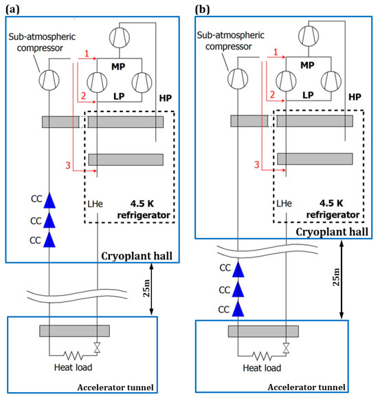 Schematic comparison of two considered layouts for cold compressor placement in the PolFEL cryogenic system: (a) cold compressors located in the cryoplant hall; (b) cold compressors located near the accelerator tunnel. Lines 1 to 3 illustrate possible ways of connecting the Sub-atmospheric compressor to the compression system.