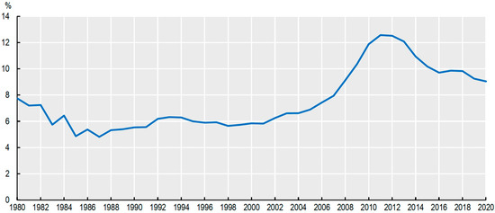 In lieu of a straightforward metric to gauge the success of low-carbon technologies, patent applications and approvals have emerged as a surrogate indicator for innovation activity. From the 1990s through the 2000s, significant advancements were made in the innovation and evolution of low-carbon energy technologies. However, since 2011, there has been a noticeable decline in the global patenting activity related to low-carbon innovation, with the share of climate-related inventions across all technological fields dropping from 12.6% of global filings in 2011 to just 9.0% by 2020, as shown in Figure 1 [64], with noticeable decline especially in Japan and the EU, as shown in Figure 2 [65].