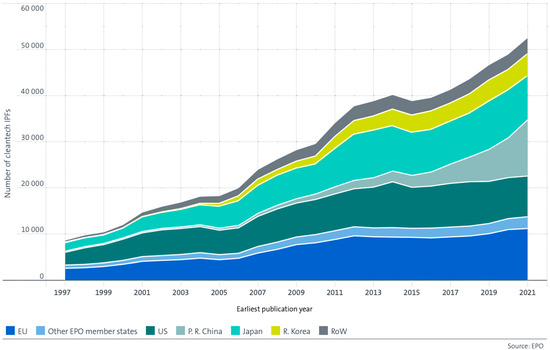 Trends in International Patent Families in clean and sustainable technologies, 1997–2021, where Japan and the EU led in the period up to 2011–2012 [65].