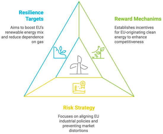 Third, in terms of resilience, only an EU-wide renewable energy storage target and strategy, alike the EU renewable energy targets and strategies set forth within Fit for 55 package [86], can boost Europe’s resilience of its own renewable energy mix and lessen strategic dependence on gas, including from Allies, which offer powerful institutional incentives for Member States to coordinate their industrial policies. This operationalization of the RRR framework is shown in Figure 3 below.