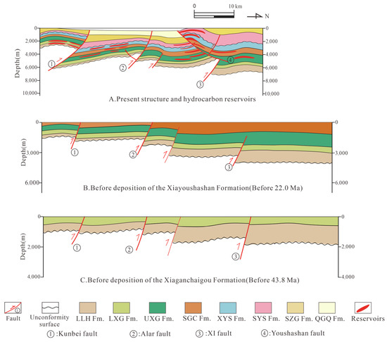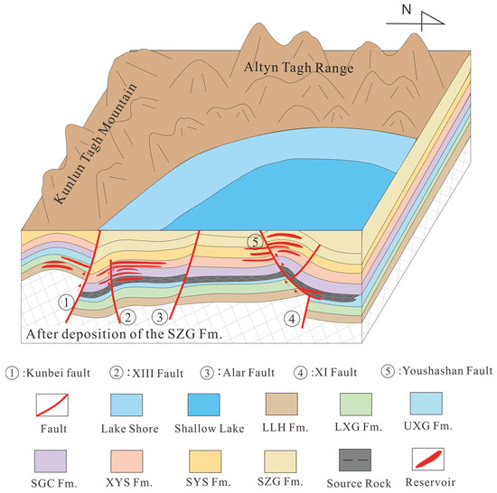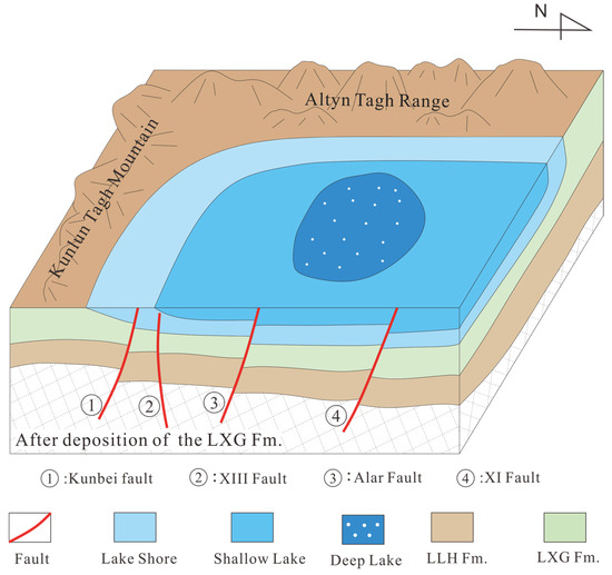 In recent years, significant progress has been made in understanding the Cenozoic evolution of the Qaidam basin, leading to the development of distinct basin evolution models [16,55]. However, increasing evidence suggests that during the early Cenozoic (65–43.8 Ma), the southwestern Qaidam basin may have experienced a phase of weak extension [11,18,27,44,55,56]. Early-activated high-angle faults, such as the Kunbei, XIII, and XI faults, under the influence of regional tectonic stresses, contributed to the formation of a half-graben-like initial basin structure in the southwestern Qaidam basin (Figure 13) [39]. These early faulting cycles also resulted in minor folding and uplift of the strata in the southwestern Qaidam region, causing bending and faulting of the strata near these faults. Consequently, early low-amplitude structural traps were formed within the LLH Fm. and the LXG Fm.