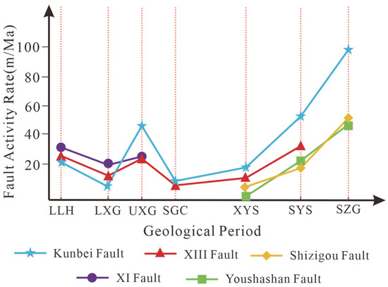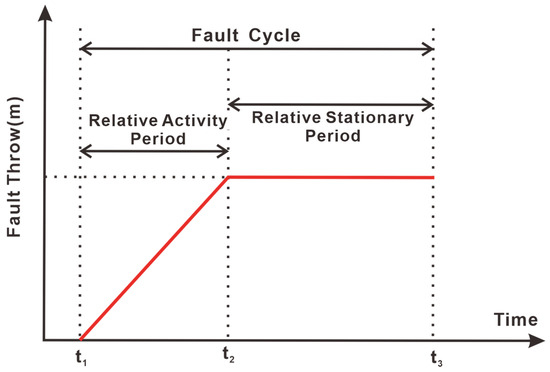 Cyclical geological processes, manifesting in tectonic and sedimentary systems, display periodic alternations between high- and low-intensity phases within a cycle [46]. In this study, we propose the concept of a “fault cycle”, which is based on the periodic nature of the fault activity and its characteristics: (1) intense activity with rapid displacement accumulation; (2) relative stability with reduced displacement rates (Figure 4). Relative stability represents sustained displacement accrual at diminished rates rather than complete quiescence.