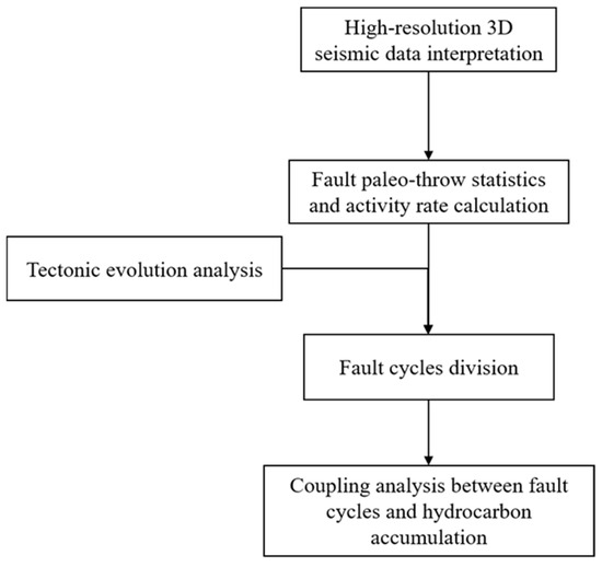 This study first conducts a detailed interpretation of three-dimensional high-resolution seismic data, characterizes the distribution patterns of strata and faults, then counts the ancient drop of faults and calculates the fault activity rate. Secondly, combined with the tectonic evolution analysis of the study area, it classifies the fault cycle mode. Finally, it comprehensively analyzes the fault cycle and oil and gas accumulation. The detailed research workflow is illustrated in Figure 5.