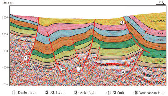 Based on the relationship between the fault development scale and hydrocarbon reservoirs in the study area, five major faults were selected for investigation: the Kunbei fault, XIII fault, Shizigou fault, Youshashan fault, and XI fault (Figure 1B).
