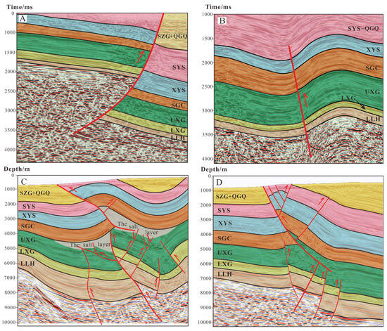 Seismic profile characteristics. (A) Seismic profile of the Kunbei fault in the Kunbei area; (B) Seismic profile of the XIII fault in the Zhahaquan area; (C) Seismic profile of the Shizigou fault in the Yingxi area; (D) Seismic profile of the Youshashan fault and XI fault in the Yingdong area.