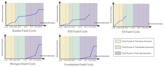 Based on the tectonic evolution and fault activity analysis, the Cenozoic fault cycle in the southwestern Qaidam basin is divided into three stages (Figure 9): the early Cenozoic (65–43.8 Ma), middle Cenozoic (43.8–22 Ma), and late Cenozoic (22 Ma-present). Three distinct fault cycle models are identified: (1) a two-phase fault cycle model for the early to middle Cenozoic (XI fault), (2) a three-phase fault cycle model representing continuous activity from the early to late Cenozoic (Kunbei and XIII faults), and (3) a single-cycle model for late Cenozoic activity (Shizigou and Youshashan faults).