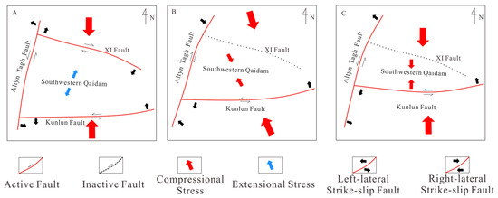 Schematic diagram of cenozoic tectonic stress field evolution in the southwestern Qaidam basin. (A) Tectonic stress field in the southwestern Qaidam basin (65–48.3 Ma). (B) Tectonic stress field in the southwestern Qaidam basin (48.3–22 Ma). (C) Tectonic stress field in the southwestern Qaidam basin (22 Ma to Present).