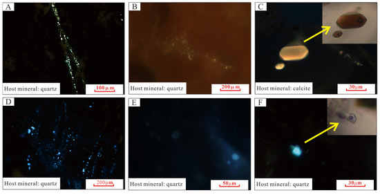 Analysis of fluid inclusions in the southwestern Qaidam basin (The arrow represents magnification). (A) Well Shi32, 4105.5 m, Yellow fluorescent oil inclusions; (B) Well Zhatan1, 4643.7 m, Hydrocarbon inclusions with a linear distribution exhibit pale yellow fluorescence; (C) Well Shi3-1, 4368 m, Yellow fluorescent oil inclusions; (D) Well Shi32, 4055 m, Blue fluorescent oil inclusions; (E) Well Zha9-3-1, 2400 m, Hydrocarbon inclusions with a planar distribution exhibit blue-white fluorescence; (F) Well Shi41-6-1, 3855 m, Blue fluorescent oil inclusions.