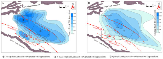 Thickness distribution of effective source rocks in southwestern Qaidam basin. (A) Sedimentary period of UXG Fm. (B) Sedimentary period of SGC Fm.
