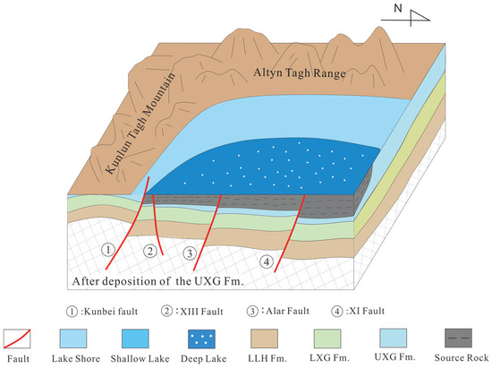 The impact of fault cycles on hydrocarbon source rocks in the southwestern Qaidam basin primarily stems from mid-Cenozoic fault activity, which significantly influenced mudstone deposition. Vigorous fault activity induced extensive basin subsidence, particularly peaking during the late Oligocene. This tectonic phase coincided with increased sediment flux [31], facilitating the continuous deposition of thick lacustrine-dark fine-grained mudstones that constitute the primary source rock systems in the southwestern basin (Figure 15).
