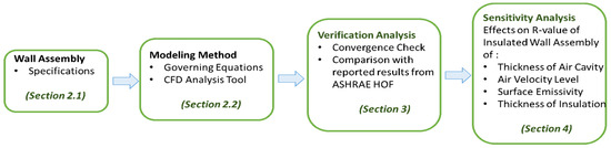Figure 1 illustrates the general analysis approach considered in this study using computational fluid dynamics (CFD) modeling. First, the wall assembly with the attached retrofit insulated panel is described in Section 2.1, including material properties and thicknesses. Then, the governing equations used in the CFD modeling analysis are outlined in Section 2.2 to determine the effective thermal performance of retrofitted wall assemblies with insulated panels. The results of the CFD analysis are verified in Section 3 with well-established data, including those listed in the ASHRAE Handbook of Fundamentals (HOF) [20]. Finally, the main findings from a series of sensitivity analyses are summarized and discussed in Section 4 to assess the impacts of various specifications of wall assembly and insulated panel.