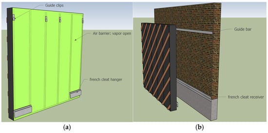 Installation details of insulated panel to the outer surface of existing wall using (a) guide clips and French cleat hangers connected to (a) back of the insulated panel and (b) guide bars and French cleat receivers connected to the outside surface of existing wall [29].