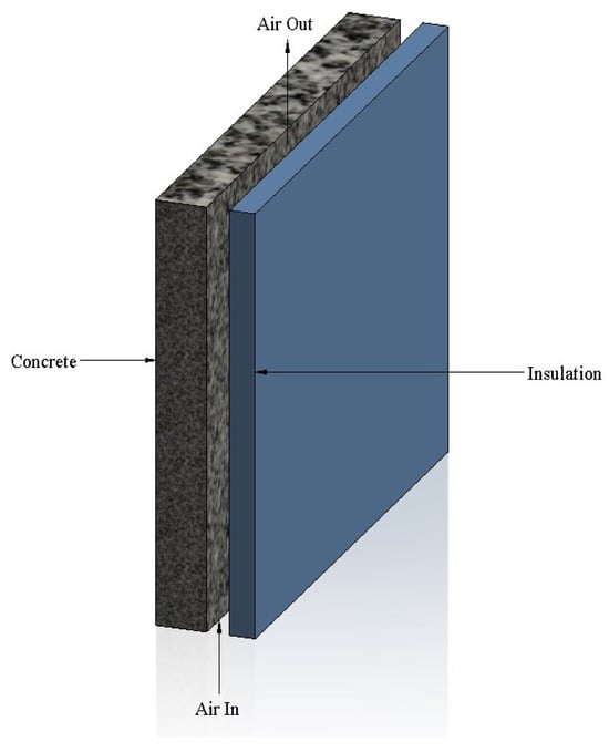 In most configurations considered in this study, the height of the wall and thickness of the concrete wall are set to be 1.0 m and 10.0 cm, while the thickness of the insulated panel can vary from 1.0 cm to 7.0 cm. Additionally, the thickness of the air cavity, located between the concrete layer and the insulated panel, is set to vary from 0.1 cm to 5.0 cm. Furthermore, the emissivity of the air cavity inner surfaces is varied from 0.1 to 0.9 while the air velocity for the case of an unsealed air cavity with forced convection is changed from 0.1 m/s to 1.0 m/s with the air flows from the inlet and exits from the outlet of the cavity as depicted in Figure 5. For unsealed air cavities, the inlet air temperature is set to be the same as the ambient outdoor temperature, Ta,air,gap.