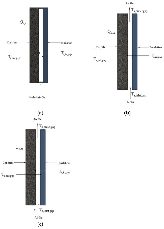 As illustrated in Figure 4, an air cavity separating the existing wall and the insulated panel wall can affect the overall heat transfer through the retrofitted wall assembly. Indeed, when the cavity is not sealed, air can freely flow by natural or forced convection and affect the thermal performance of the wall assembly. In addition to the airflow type and rate, the thermal performance of the insulated wall assembly can depend on several factors, including surface emissivity, air thickness, and indoor–outdoor difference. Figure 5 illustrates the three cases of airflow within the air cavity analyzed throughout this study, including a sealed cavity (Figure 5a) and an unsealed air gap with natural convection cavity with free flow of air by natural convection (Figure 5b) or forced convection with a predefined inlet air flow velocity (Figure 5c).