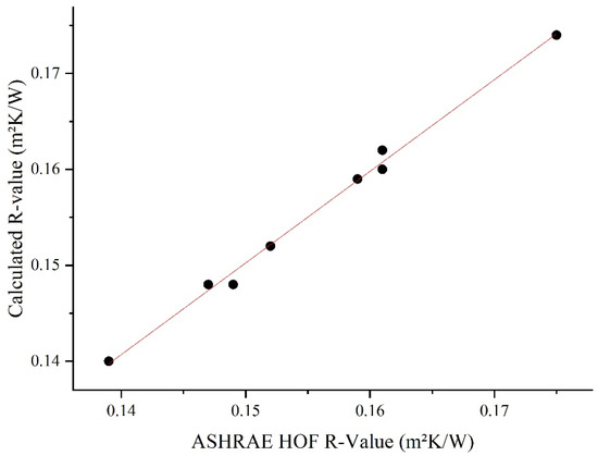 Specifically, ASHRAE HOF indicates that the R-value for a sealed air gap with a thickness of 1.3 cm, at a temperature difference of 15 °C, and an average air cavity temperature of 10 °C is 0.16129 m2K/W [18]. Using the CFD modeling approach used in this study based on Equation (1) through Equation (4) with the boundary temperatures at the inside and outside surfaces of the exterior wall assembly set to be 281 K and 296 K, the R-values for both the air cavity and the overall wall assembly are estimated as listed in Table 2 for various mesh configurations having different numbers of nodes. The CFD analysis results are generally very close to the reported ASHRAE HOF value for all the considered mesh configurations, indicating that accurate solutions for assessing thermal interactions within the wall assembly, including the sealed air cavity, can be determined even for coarse mesh configurations.