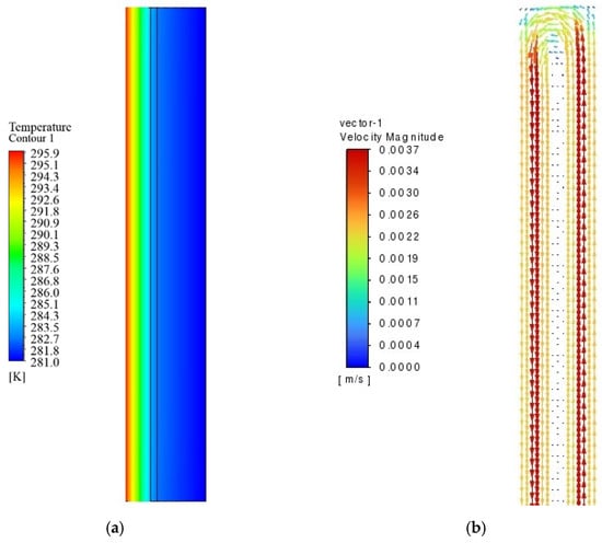 Figure 7 presents both the temperature and air velocity obtained by the CFD-based solution for a wall assembly (Figure 4) with a 1.3 cm sealed air cavity. The inner and outer surfaces for the wall assembly are set from 281 K to 296 K, respectively. As outlined in Figure 7a, there is a gradual change in temperature from the outer to the inner surfaces. The consistent temperature gradient indicates that heat is transferring from the warmer indoors to the cooler outdoors through the insulation panel to the concrete layer, passing through the air space, which is acting as an added insulating layer. Moreover, the air velocity within the air cavity shown by Figure 7b highlights the mechanism of heat transfer driven by natural convection airflow loop due to the temperature differences, where warmer air near the insulation panel rises while cooler air near the concrete surfaces flows downwards. This convection loop helps distribute heat within the air cavity. The overall minimal temperature gradient at the sealed air cavity is translated into a reduced heat transfer through the wall assembly.