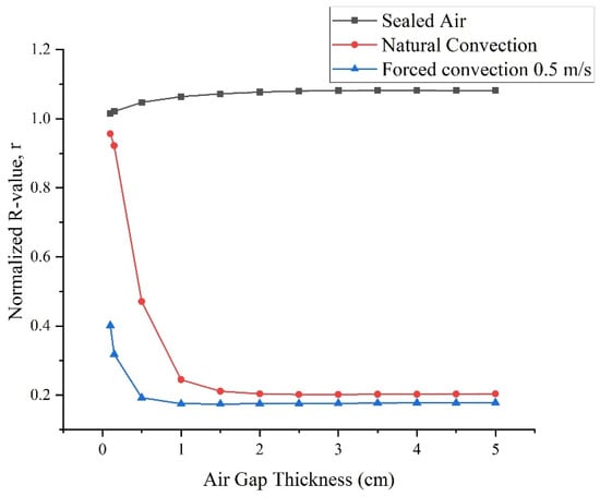 To better assess the impact of the air cavity between the insulated panel and the existing wall assembly, the R-value obtained by Equation (5) is normalized by the R-value of the insulated wall assembly when no air cavity exists, Rwall-no-gap. This normalization allows for a direct comparison of thermal resistance contributed by the air cavity relative to that of the baseline configuration with no air cavity. Thus, the normalized overall R-value, r, is estimated as follows: