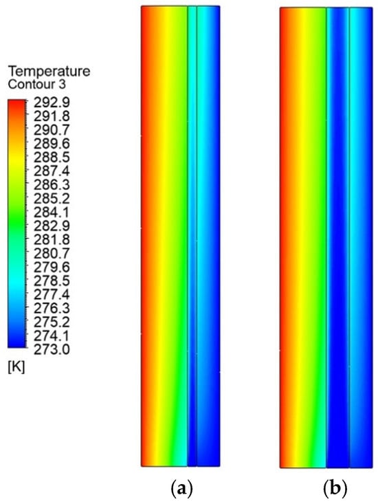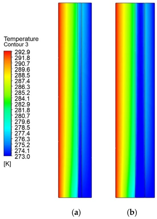 For the case of a 2 cm air gap thickness (Figure 9a), the temperature distribution shows a more pronounced gradient from cooler to warmer regions, indicating significant temperature variation across the wall. In contrast, the case of a 5 cm air cavity (Figure 9b) provides a more uniform temperature distribution across the air cavity with a reduced gradient, indicating better thermal insulating effects for the air layer. The case of a 2 cm air cavity exhibits a distinct temperature gradient, which is less pronounced for the case of a 5 cm air cavity. The temperatures at the surfaces of the air cavity are higher than those within the air cavity itself due to the radiative heat transfer occurring between these surfaces.